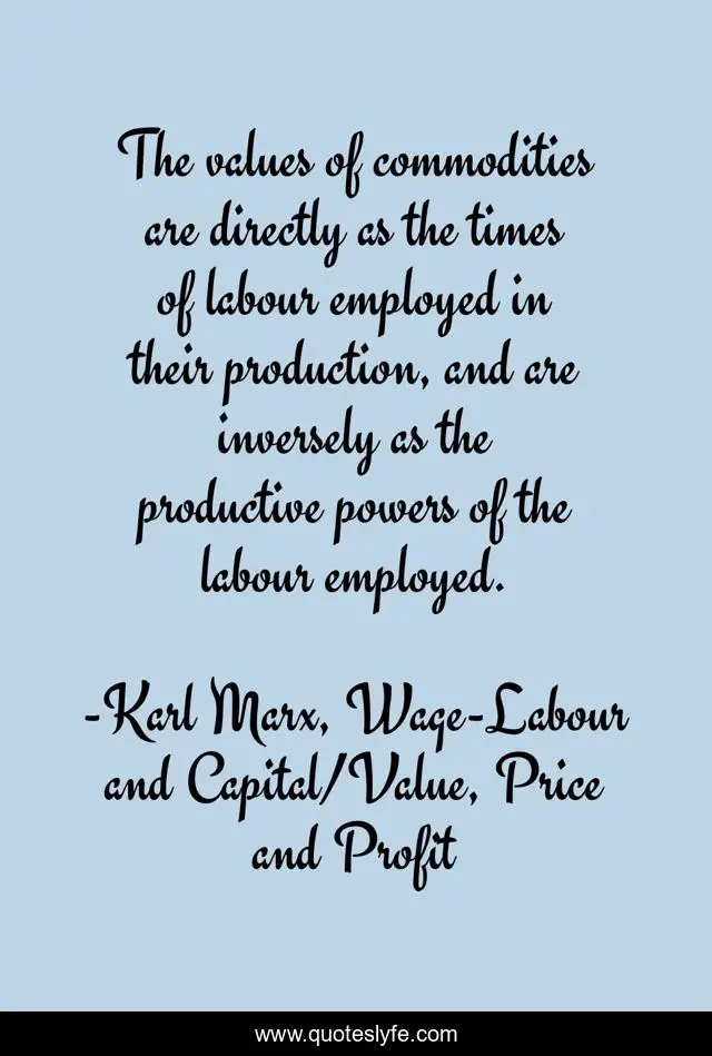 This page presents the quote "The values of commodities are directly as the times of labour employed in their production, and are inversely as the productive powers of the labour employed.". Author of this quote is Karl Marx, Wage-Labour and Capital/Value, Price and Profit. This quote is about theory, economics, marxian-economics, labor-theory-of-value, marxism, marx,.