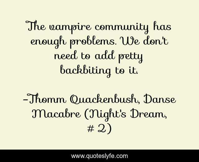 This page presents the quote "The vampire community has enough problems. We don't need to add petty backbiting to it.". Author of this quote is Thomm Quackenbush, Danse Macabre (Night's Dream, #2). This quote is about backbiting, problems, vampire, community,.
