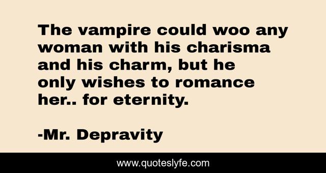 This page presents the quote "The vampire could woo any woman with his charisma and his charm, but he only wishes to romance her.. for eternity.". Author of this quote is Mr. Depravity. This quote is about eternity, wooing, love, vampire, romance, charisma, charm, affection,.