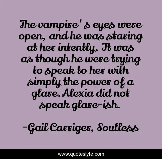 This page presents the quote "The vampire's eyes were open, and he was staring at her intently. It was as though he were trying to speak to her with simply the power of a glare.Alexia did not speak glare-ish.". Author of this quote is Gail Carriger, Soulless. This quote is about soulless, alexia-tarabotti, vampire,.
