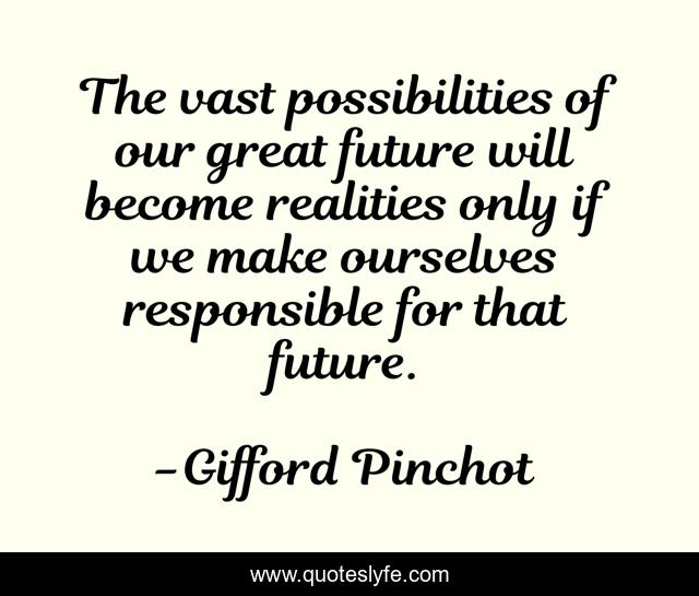 This page presents the quote "The vast possibilities of our great future will become realities only if we make ourselves responsible for that future.". Author of this quote is Gifford Pinchot. This quote is about future, responsible,.