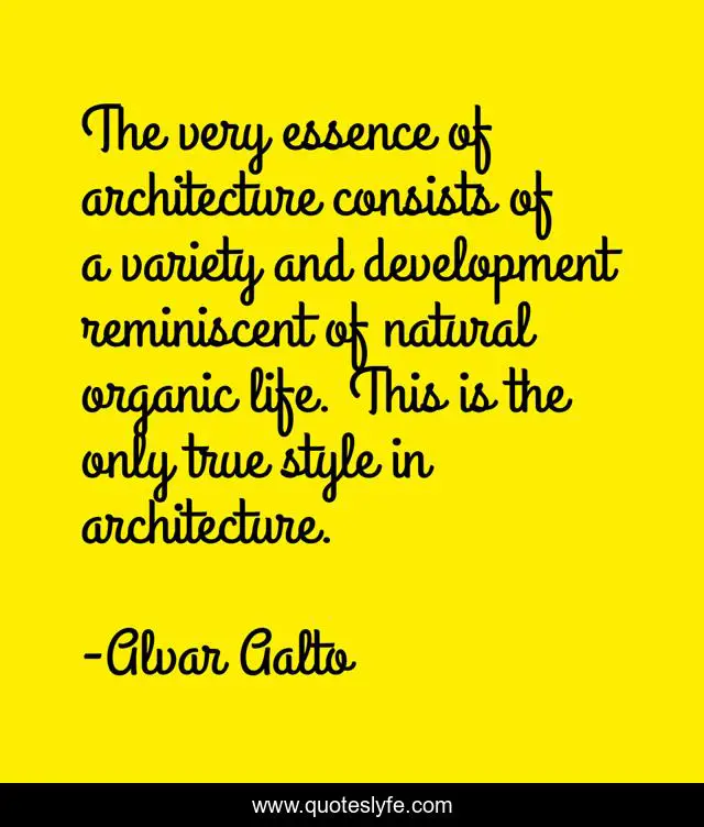 This page presents the quote "The very essence of architecture consists of a variety and development reminiscent of natural organic life. This is the only true style in architecture.". Author of this quote is Alvar Aalto. This quote is about development, life, style,.
