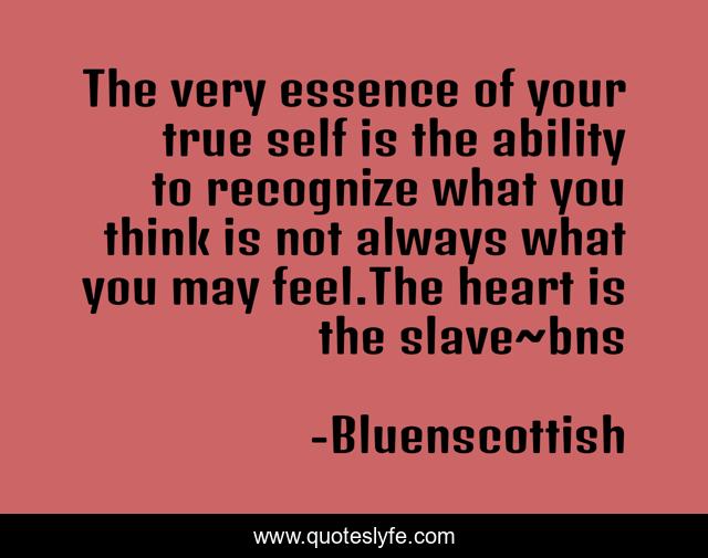 This page presents the quote "The very essence of your true self is the ability to recognize what you think is not always what you may feel.The heart is the slave~bns". Author of this quote is Bluenscottish. .