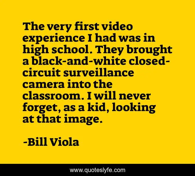 This page presents the quote "The very first video experience I had was in high school. They brought a black-and-white closed-circuit surveillance camera into the classroom. I will never forget, as a kid, looking at that image.". Author of this quote is Bill Viola. This quote is about looking, school, high school,.