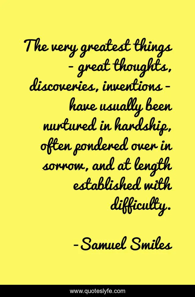This page presents the quote "The very greatest things - great thoughts, discoveries, inventions - have usually been nurtured in hardship, often pondered over in sorrow, and at length established with difficulty.". Author of this quote is Samuel Smiles. This quote is about sorrow, greatest, thoughts,.