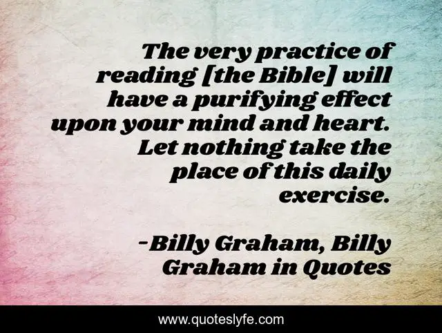 This page presents the quote "The very practice of reading [the Bible] will have a purifying effect upon your mind and heart. Let nothing take the place of this daily exercise.". Author of this quote is Billy Graham, Billy Graham in Quotes. This quote is about bible, billy-graham,.