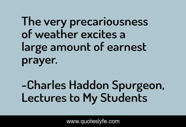 This page presents the quote "The very precariousness of weather excites a large amount of earnest prayer.". Author of this quote is Charles Haddon Spurgeon, Lectures to My Students. This quote is about circumstances, humility,.