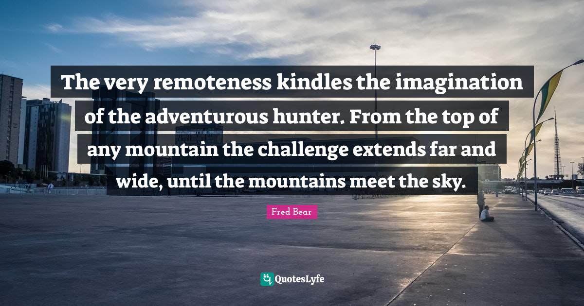 This page presents the quote "The very remoteness kindles the imagination of the adventurous hunter. From the top of any mountain the challenge extends far and wide, until the mountains meet the sky.". Author of this quote is Fred Bear. This quote is about adventurous, challenges, sky, mountain, imagination, wide, kindles,.