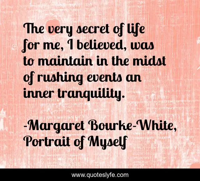 This page presents the quote "The very secret of life for me, I believed, was to maintain in the midst of rushing events an inner tranquility.". Author of this quote is Margaret Bourke-White, Portrait of Myself. This quote is about tranquility, photography, women-artists,.