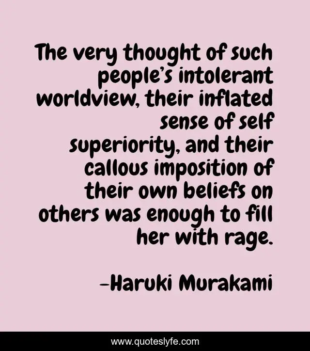 This page presents the quote "The very thought of such people’s intolerant worldview, their inflated sense of self superiority, and their callous imposition of their own beliefs on others was enough to fill her with rage.". Author of this quote is Haruki Murakami. This quote is about religion, belief, worldview,.