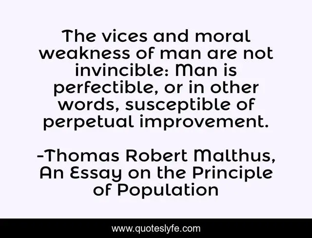 This page presents the quote "The vices and moral weakness of man are not invincible: Man is perfectible, or in other words, susceptible of perpetual improvement.". Author of this quote is Thomas Robert Malthus, An Essay on the Principle of Population. This quote is about weakness, morality, man, vices,.