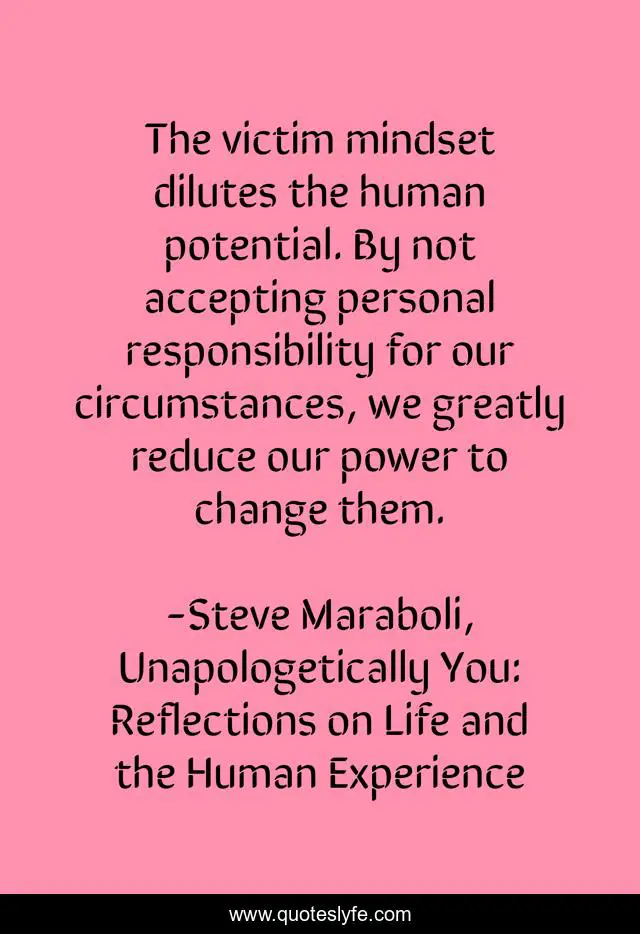 This page presents the quote "The victim mindset dilutes the human potential. By not accepting personal responsibility for our circumstances, we greatly reduce our power to change them.". Author of this quote is Steve Maraboli, Unapologetically You: Reflections on Life and the Human Experience. This quote is about personal-responsibility, success, power, inspirational, potential, responsibility, happiness, victim, enthusiasm,.