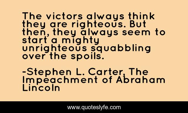 This page presents the quote "The victors always think they are righteous. But then, they always seem to start a mighty unrighteous squabbling over the spoils.". Author of this quote is Stephen L. Carter, The Impeachment of Abraham Lincoln. This quote is about self-righteousness, division, pride,.