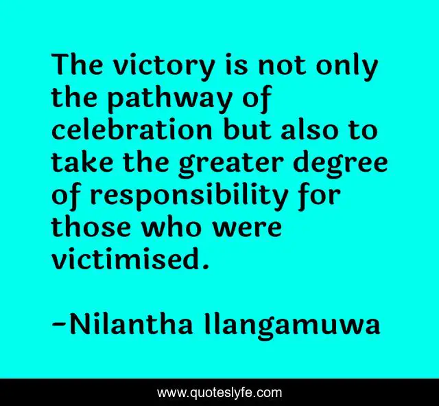 This page presents the quote "The victory is not only the pathway of celebration but also to take the greater degree of responsibility for those who were victimised.". Author of this quote is Nilantha Ilangamuwa. .