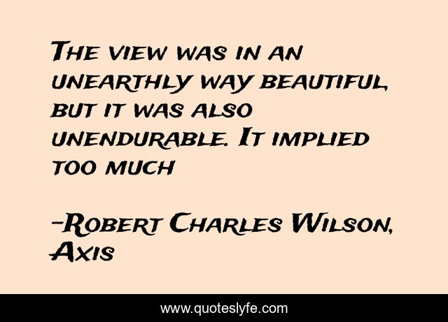 This page presents the quote "The view was in an unearthly way beautiful, but it was also unendurable. It implied too much". Author of this quote is Robert Charles Wilson, Axis. This quote is about magnificence, beauty, unbearable,.