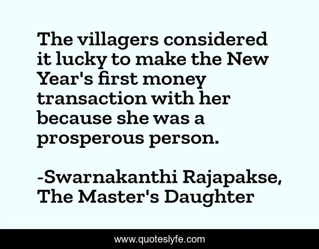 This page presents the quote "The villagers considered it lucky to make the New Year's first money transaction with her because she was a prosperous person.". Author of this quote is Swarnakanthi Rajapakse, The Master's Daughter. This quote is about drummers, srilanka, sinhalese, cinnamon-gardens, culture, village, caste,.
