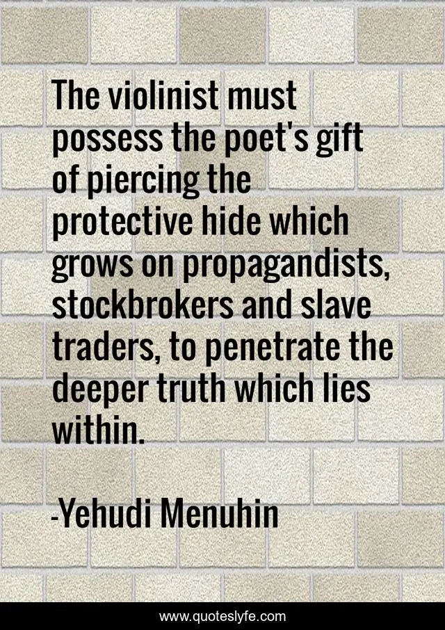 This page presents the quote "The violinist must possess the poet's gift of piercing the protective hide which grows on propagandists, stockbrokers and slave traders, to penetrate the deeper truth which lies within.". Author of this quote is Yehudi Menuhin. This quote is about within, slave, gift,.