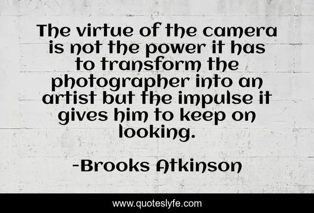 This page presents the quote "The virtue of the camera is not the power it has to transform the photographer into an artist but the impulse it gives him to keep on looking.". Author of this quote is Brooks Atkinson. .