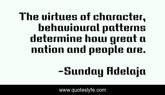 This page presents the quote "The virtues of character, behavioural patterns determine how great a nation and people are.". Author of this quote is Sunday Adelaja. This quote is about behaviour, great, character, virtues, nation,.