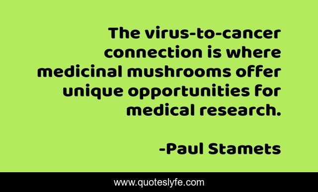 This page presents the quote "The virus-to-cancer connection is where medicinal mushrooms offer unique opportunities for medical research.". Author of this quote is Paul Stamets. This quote is about opportunities, research,.