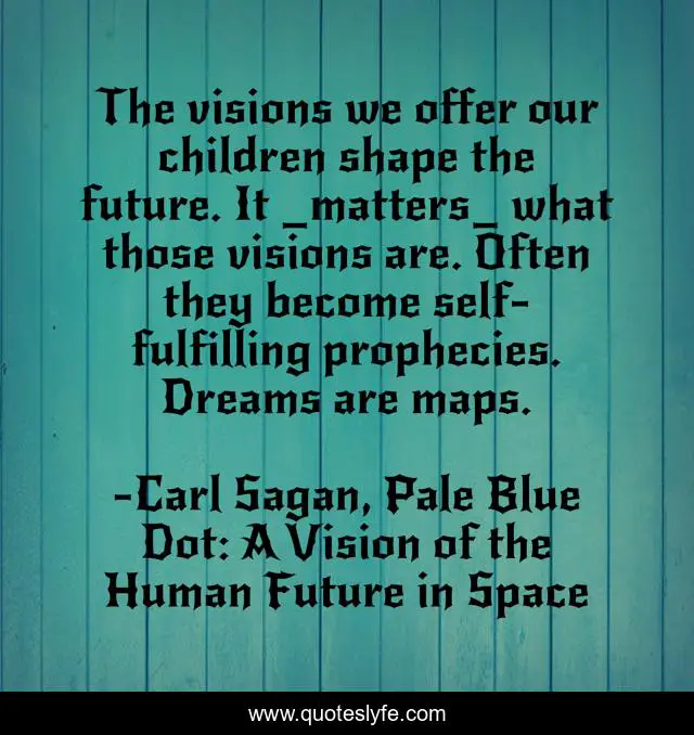 This page presents the quote "The visions we offer our children shape the future. It _matters_ what those visions are. Often they become self-fulfilling prophecies. Dreams are maps.". Author of this quote is Carl Sagan, Pale Blue Dot: A Vision of the Human Future in Space. This quote is about future, children, dreams, hope,.