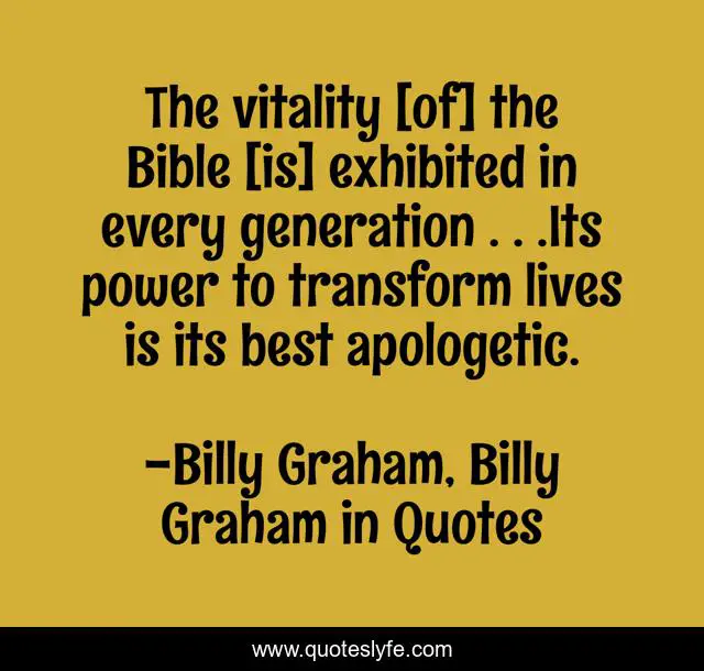 This page presents the quote "The vitality [of] the Bible [is] exhibited in every generation . . .Its power to transform lives is its best apologetic.". Author of this quote is Billy Graham, Billy Graham in Quotes. This quote is about bible, billy-graham,.