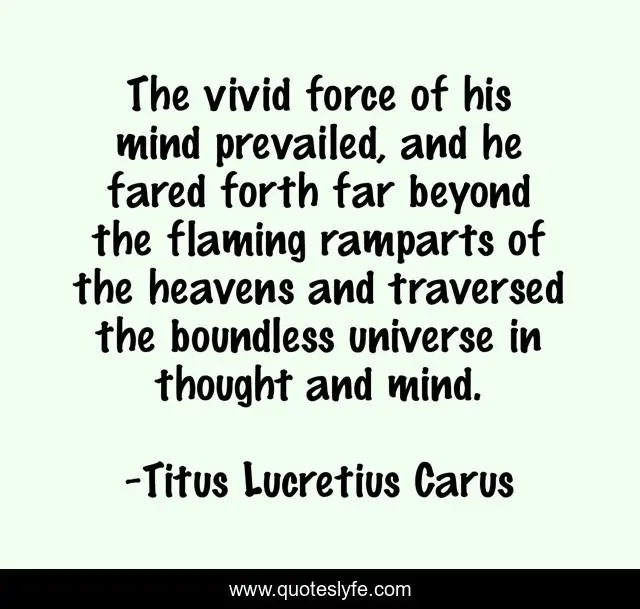 This page presents the quote "The vivid force of his mind prevailed, and he fared forth far beyond the flaming ramparts of the heavens and traversed the boundless universe in thought and mind.". Author of this quote is Titus Lucretius Carus. This quote is about thought, universe, heaven, mind, philosophy,.