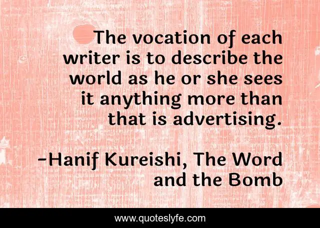This page presents the quote "The vocation of each writer is to describe the world as he or she sees it anything more than that is advertising.". Author of this quote is Hanif Kureishi, The Word and the Bomb. .