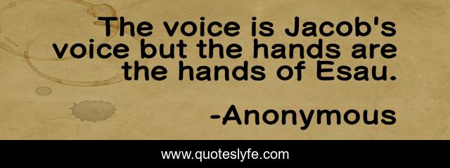 This page presents the quote "The voice is Jacob's voice but the hands are the hands of Esau.". Author of this quote is Anonymous. .