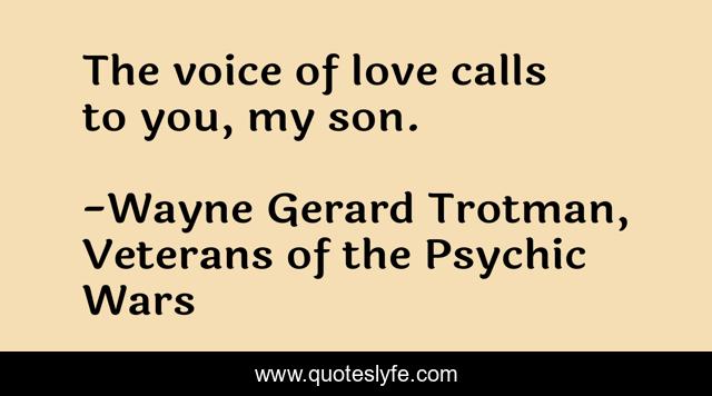 This page presents the quote "The voice of love calls to you, my son.". Author of this quote is Wayne Gerard Trotman, Veterans of the Psychic Wars. This quote is about caring, duty, love, calling, romance, responsibility, voice, affection,.