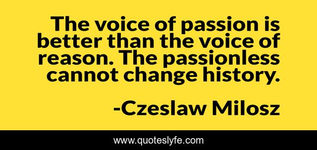 This page presents the quote "The voice of passion is better than the voice of reason. The passionless cannot change history.". Author of this quote is Czeslaw Milosz. This quote is about voice, passion, change,.
