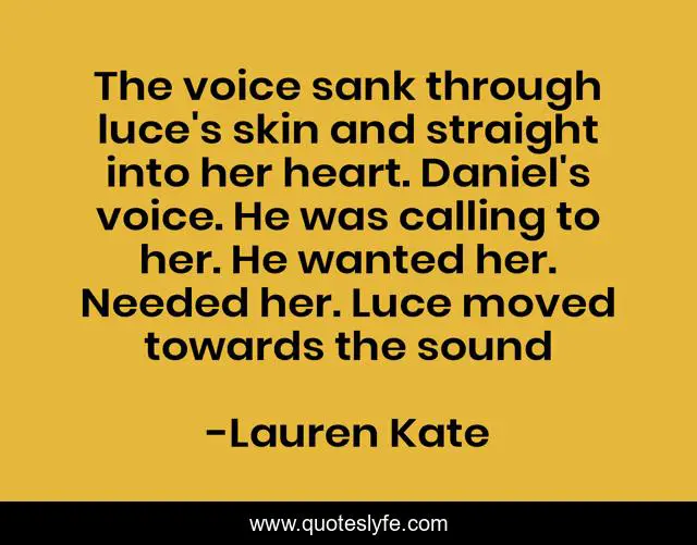 This page presents the quote "The voice sank through luce's skin and straight into her heart. Daniel's voice. He was calling to her. He wanted her. Needed her. Luce moved towards the sound". Author of this quote is Lauren Kate. This quote is about luce, daniel, passion,.