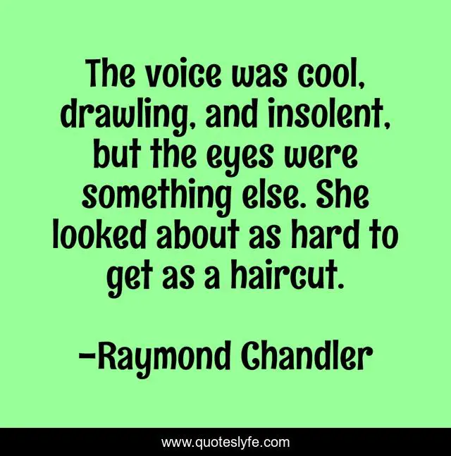 This page presents the quote "The voice was cool, drawling, and insolent, but the eyes were something else. She looked about as hard to get as a haircut.". Author of this quote is Raymond Chandler. This quote is about similes, eyes, voice,.