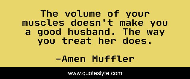 This page presents the quote "The volume of your muscles doesn't make you a good husband. The way you treat her does.". Author of this quote is Amen Muffler. This quote is about life, love, reality-of-life, married-life, husband, reality, affection,.