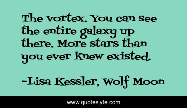 This page presents the quote "The vortex. You can see the entire galaxy up there. More stars than you ever knew existed.". Author of this quote is Lisa Kessler, Wolf Moon. This quote is about horse-trainer, urban-fantasy-romance, paranormal-romance, wolf-shifter-romance,.