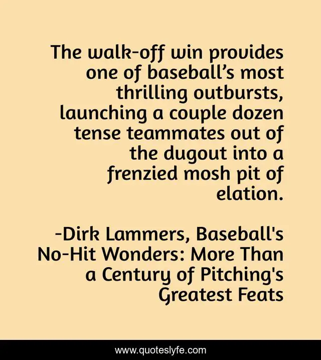 This page presents the quote "The walk-off win provides one of baseball’s most thrilling outbursts, launching a couple dozen tense teammates out of the dugout into a frenzied mosh pit of elation.". Author of this quote is Dirk Lammers, Baseball's No-Hit Wonders: More Than a Century of Pitching's Greatest Feats. This quote is about win, walk-off, baseball,.