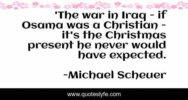 This page presents the quote "'The war in Iraq - if Osama was a Christian - it's the Christmas present he never would have expected.". Author of this quote is Michael Scheuer. This quote is about christian, war, present,.