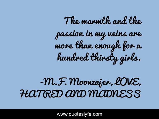 This page presents the quote "The warmth and the passion in my veins are more than enough for a hundred thirsty girls.". Author of this quote is M.F. Moonzajer, LOVE, HATRED AND MADNESS. This quote is about girls, enough, passion, veins, teens, hundred, warmth,.