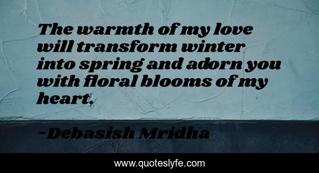 This page presents the quote "The warmth of my love will transform winter into spring and adorn you with floral blooms of my heart.". Author of this quote is Debasish Mridha. This quote is about blooms-of-my-heart, winter, spring, philosophy, debasish-mridha, quotes, transform-winter, inspirational, enthusiasm,.