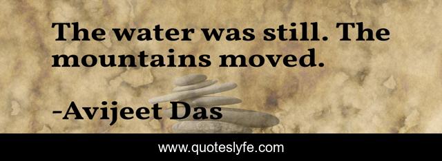 This page presents the quote "The water was still. The mountains moved.". Author of this quote is Avijeet Das. This quote is about water, life-philosophy, life-and-sayings, mountains,.