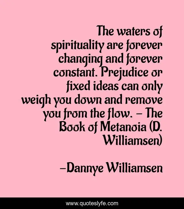 This page presents the quote "The waters of spirituality are forever changing and forever constant. Prejudice or fixed ideas can only weigh you down and remove you from the flow. - The Book of Metanoia (D. Williamsen)". Author of this quote is Dannye Williamsen. This quote is about enthusiasm, inspirational, wisdom,.