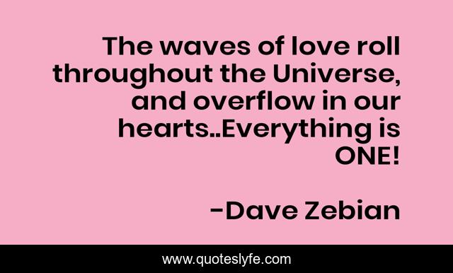 This page presents the quote "The waves of love roll throughout the Universe, and overflow in our hearts..Everything is ONE!". Author of this quote is Dave Zebian. This quote is about love, consciousness, soul, we-are-one, oneness, hearts, spirit, affection,.