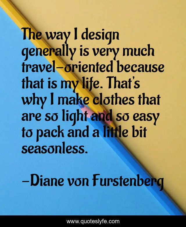 This page presents the quote "The way I design generally is very much travel-oriented because that is my life. That's why I make clothes that are so light and so easy to pack and a little bit seasonless.". Author of this quote is Diane von Furstenberg. This quote is about light, life, easy,.