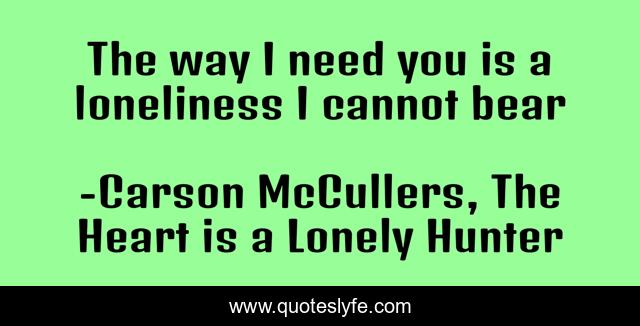 This page presents the quote "The way I need you is a loneliness I cannot bear". Author of this quote is Carson McCullers, The Heart is a Lonely Hunter. .