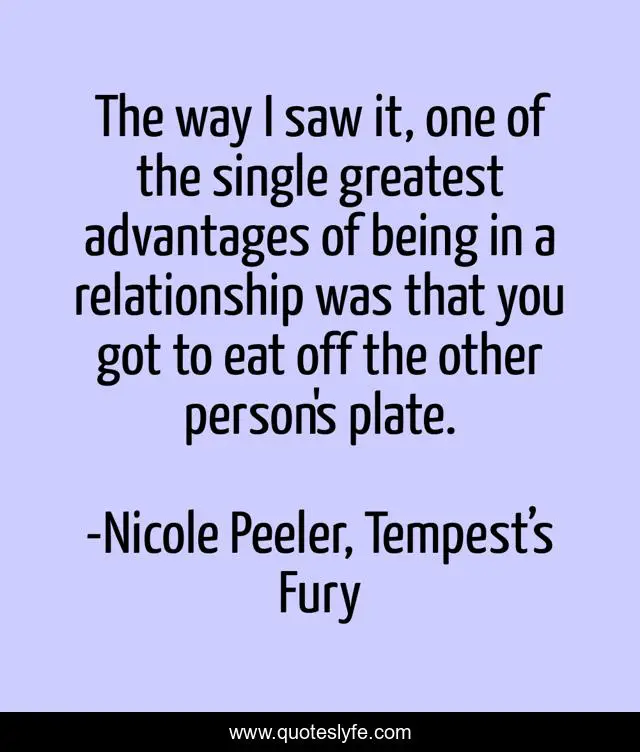 This page presents the quote "The way I saw it, one of the single greatest advantages of being in a relationship was that you got to eat off the other person's plate.". Author of this quote is Nicole Peeler, Tempest’s Fury. This quote is about food, relationships,.