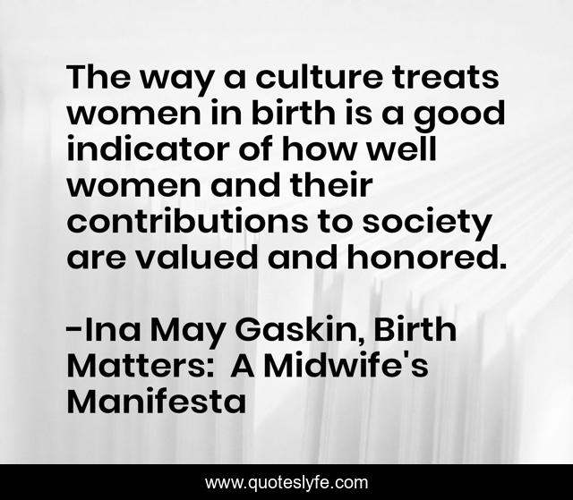 This page presents the quote "The way a culture treats women in birth is a good indicator of how well women and their contributions to society are valued and honored.". Author of this quote is Ina May Gaskin, Birth Matters: A Midwife's Manifesta. This quote is about culture, women,.
