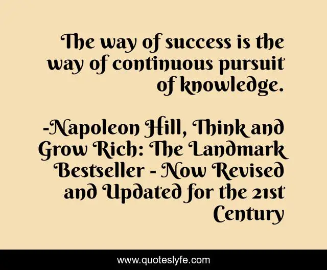 This page presents the quote "The way of success is the way of continuous pursuit of knowledge.". Author of this quote is Napoleon Hill, Think and Grow Rich: The Landmark Bestseller - Now Revised and Updated for the 21st Century. This quote is about success, knowledge, way, pursuit,.