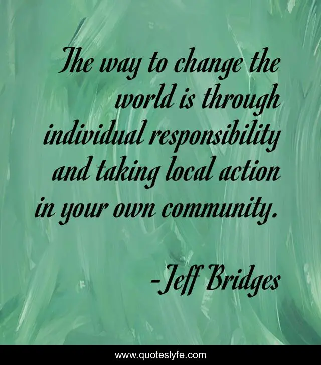 This page presents the quote "The way to change the world is through individual responsibility and taking local action in your own community.". Author of this quote is Jeff Bridges. This quote is about responsibility, community,.