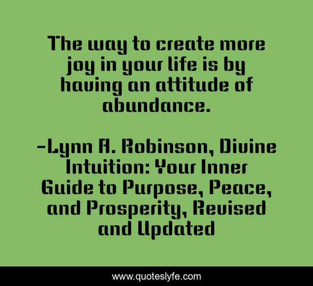 This page presents the quote "The way to create more joy in your life is by having an attitude of abundance.". Author of this quote is Lynn A. Robinson, Divine Intuition: Your Inner Guide to Purpose, Peace, and Prosperity, Revised and Updated. This quote is about abundance, spirituality, intuition, divine-intuition, manifestation,.