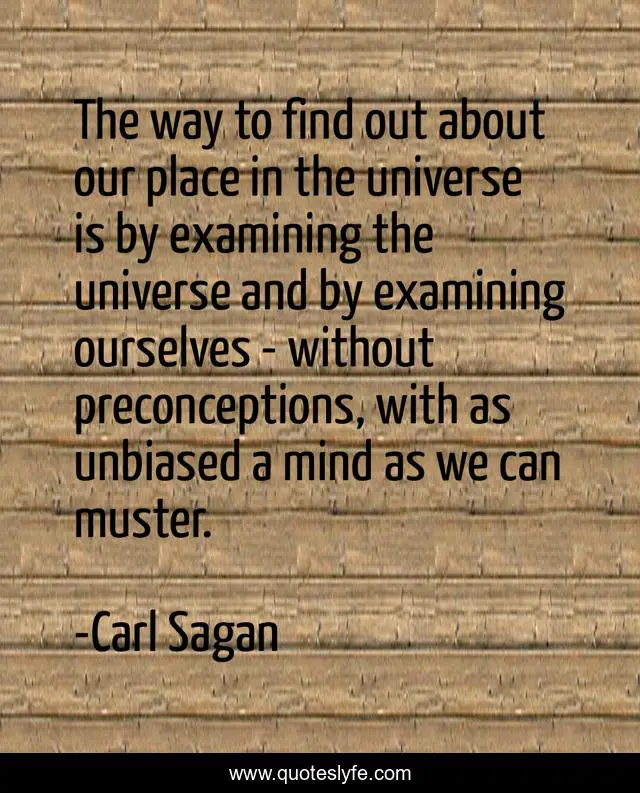 This page presents the quote "The way to find out about our place in the universe is by examining the universe and by examining ourselves - without preconceptions, with as unbiased a mind as we can muster.". Author of this quote is Carl Sagan. .